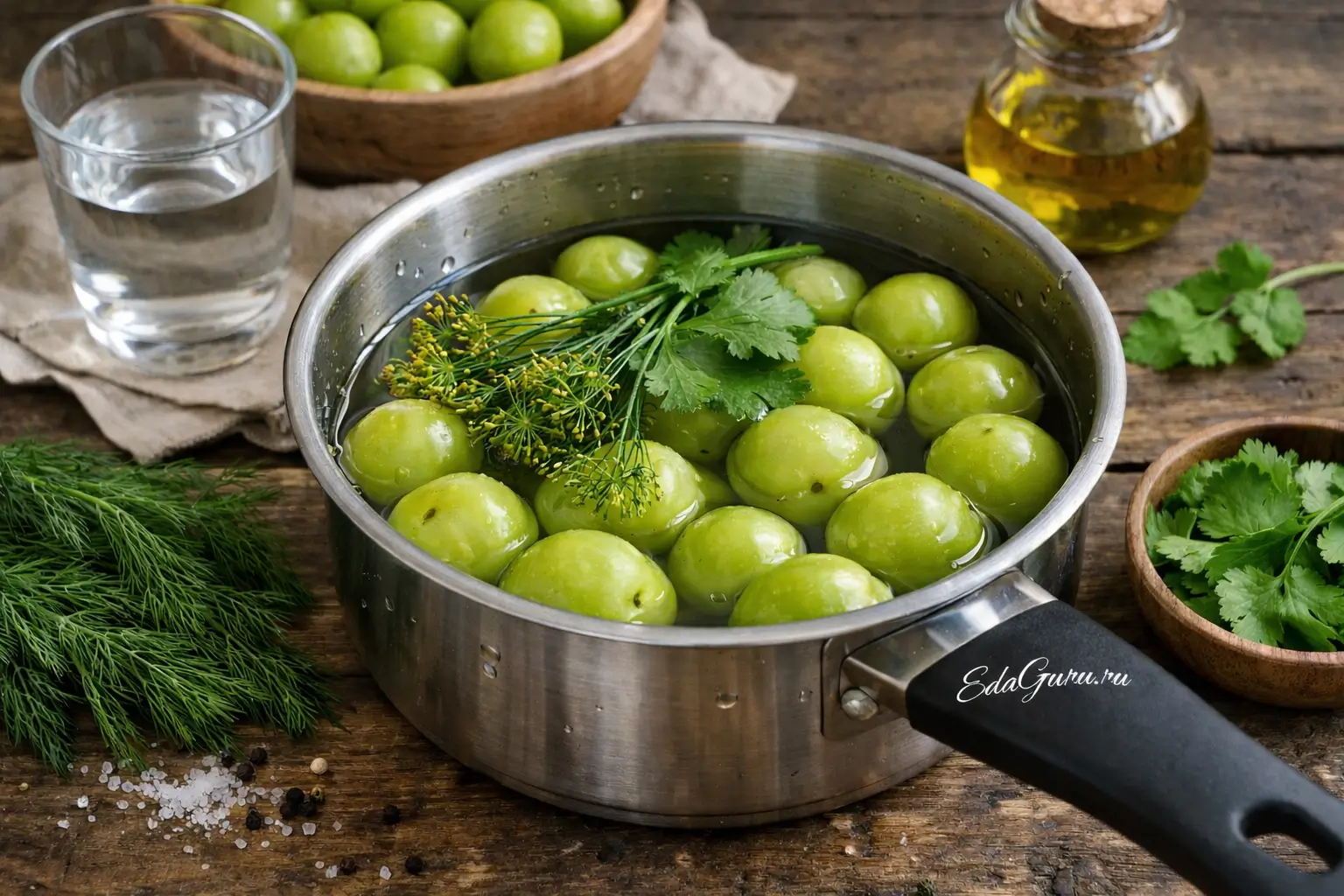 Если нет омбало, берите обычную мяту в меньшем количестве — она ярче и может перебить сливу; зонтики укропа при желании можно заменить зонтиками фенхеля, если хотите более анисовый, пряный оттенок.