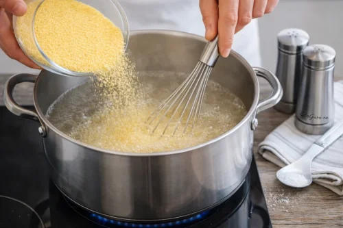 В кастрюле доведите до кипения 1500 мл воды и посолите. Затем, постоянно помешивая венчиком, понемногу всыпайте крупу, чтобы не образовались комочки.