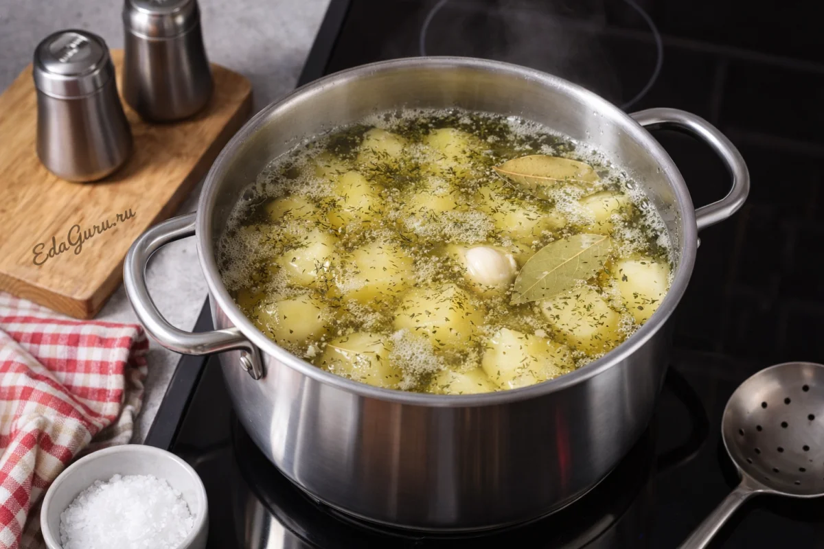 Очищенный картофель залейте водой и поставьте на огонь. Когда вода закипит, всыпьте соль, добавьте лавровые листья, зубчик чеснока и сушеный укроп для аромата, затем варите картофель до мягкости 25–35 минут. Чтобы картофель сварился быстрее, разрежьте клубни на несколько частей, если они крупные.
