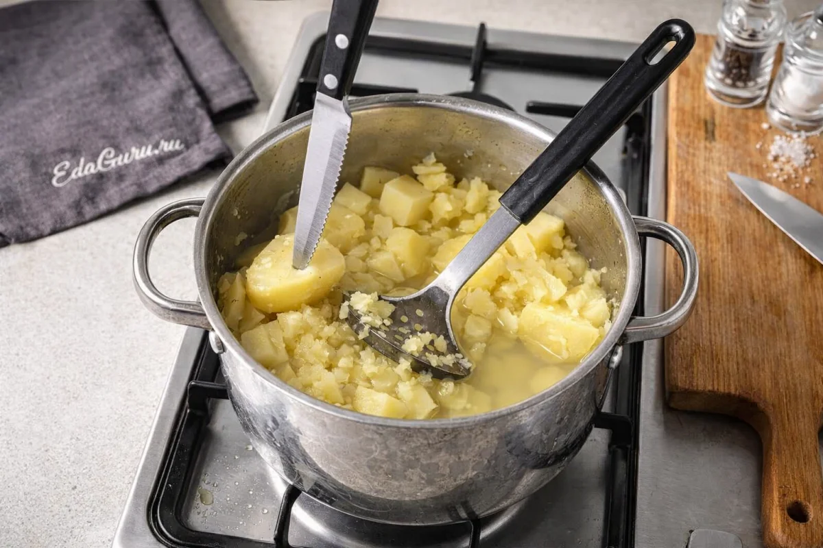 Проверьте, сварился ли картофель: нож должен входить в клубень без усилий. Затем слейте воду, но немного бульона сохраните — он может пригодиться для пюре. Разомните картофель толкушкой до однородной массы. Если пюре кажется слишком густым, подлейте чуть-чуть оставленного бульона.