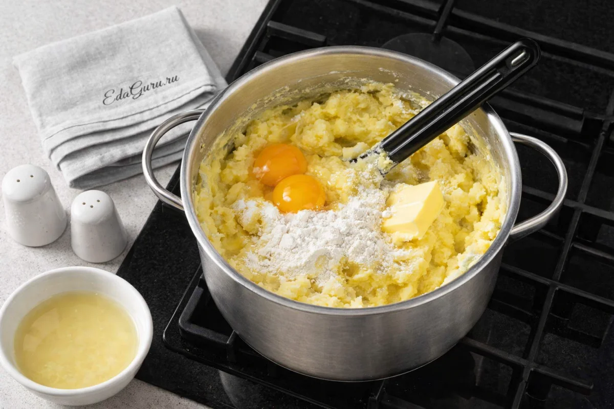 В картофельное пюре положите сливочное масло, 1–2 яйца и 2 ложки пшеничной муки, затем хорошо все перемешайте. После этого дайте картофельной массе немного остыть. Яйца лучше добавлять не в слишком горячее пюре, чтобы они не свернулись.