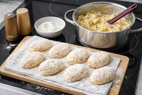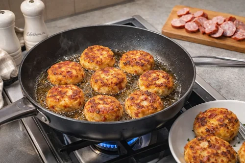 Картофельные котлеты с колбасой — простой домашний вариант блюда из доступных продуктов. Его основа связана с распространённой в Европе традицией готовить котлеты и оладьи из варёного картофеля. После того как картофель широко вошёл в рацион в XVIII–XIX веках, подобные рецепты стали особенно популярны благодаря сытности и невысокой стоимости. Колбаса в таких котлетах служит добавкой, которая усиливает вкус и делает блюдо более питательным. Рецепт вам понравится за то, что он помогает использовать оставшийся варёный картофель и готовые мясные продукты без сложной подготовки.