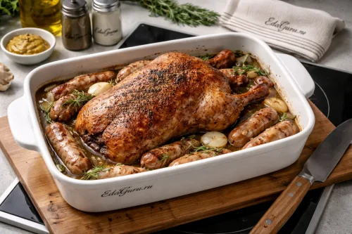 Утка с капустой и яблоками — классическое сочетание, основанное на реальных кулинарных традициях Центральной и Восточной Европы. Жирное и насыщенное мясо утки хорошо сочетается с кисло-сладкими вкусами: яблоки добавляют мягкую фруктовую ноту, а капуста — свежесть и лёгкую кислинку. Особенно часто рядом с уткой подают тушёную или квашеную капусту — такой гарнир отлично сочетается с мясом. Яблоки для запекания с птицей используют давно: они выделяют сок, делают вкус богаче и хорошо сочетаются со специями. Это блюдо уместно и для праздничного стола, и для семейного ужина, потому что выглядит нарядно, а набор продуктов остаётся понятным и традиционным.