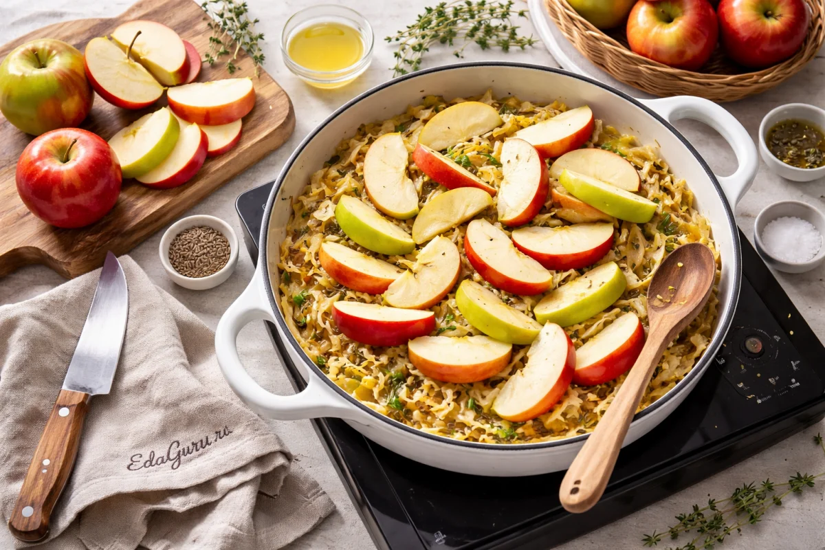 Нарезанные дольками яблоки распределите поверх капусты, уложив их в жаровню.