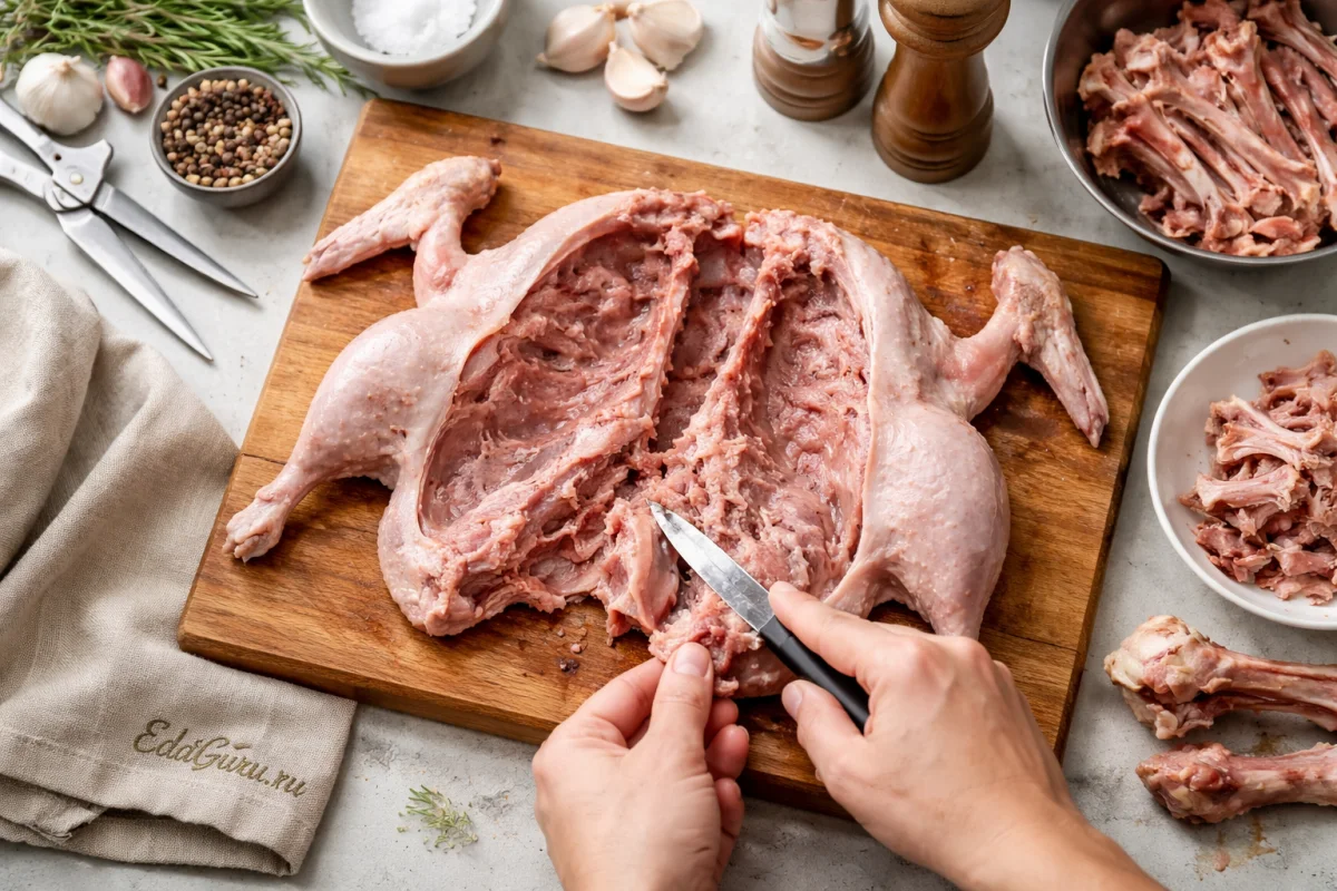 Когда будете готовить, выньте утку из воды и тщательно промокните бумажными полотенцами. Затем займитесь разделкой: срежьте крайние части крыльев, удалите позвоночник вместе с гузкой, после чего разверните. Аккуратно извлеките остальные кости, оставив их только в крыльях и ногах.