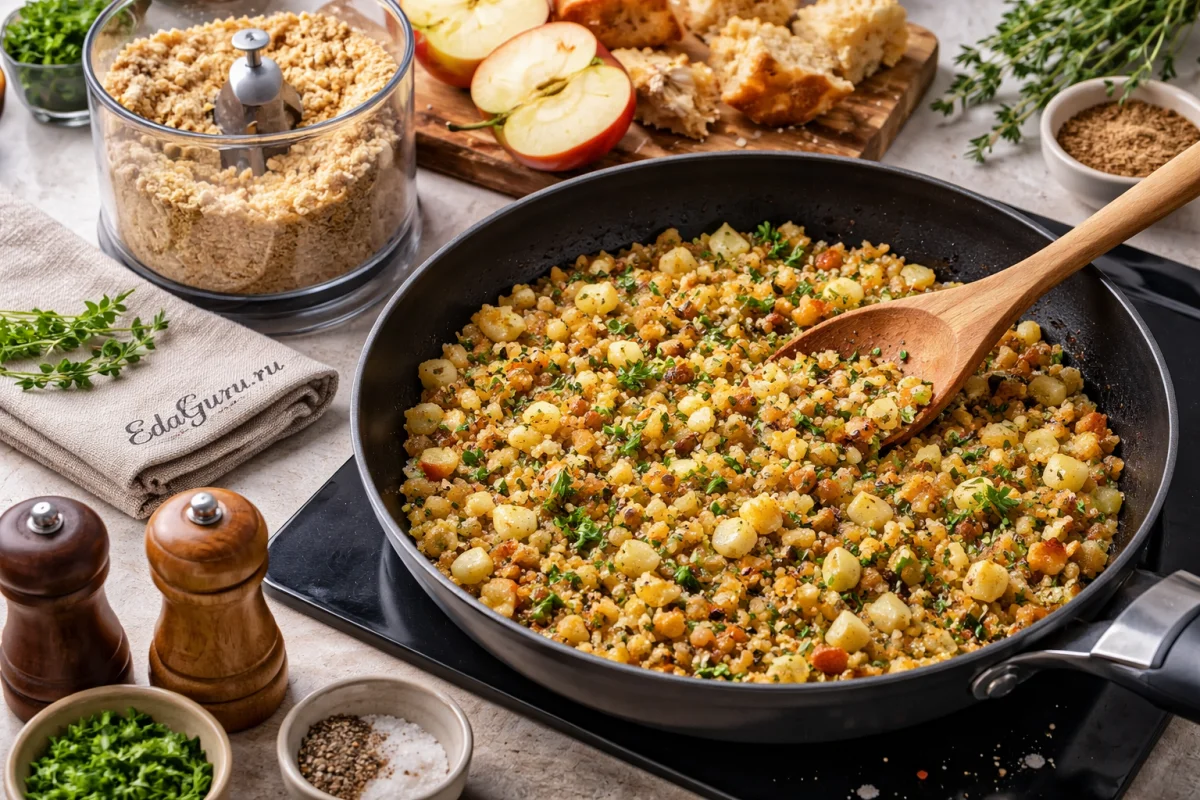 Подсохший хлеб измельчите. Переложите ее в сковороду к яблокам и луку и немного прогрейте. Затем всыпьте порубленную зелень, тимьян, добавьте мускатный орех, посолите и поперчите.