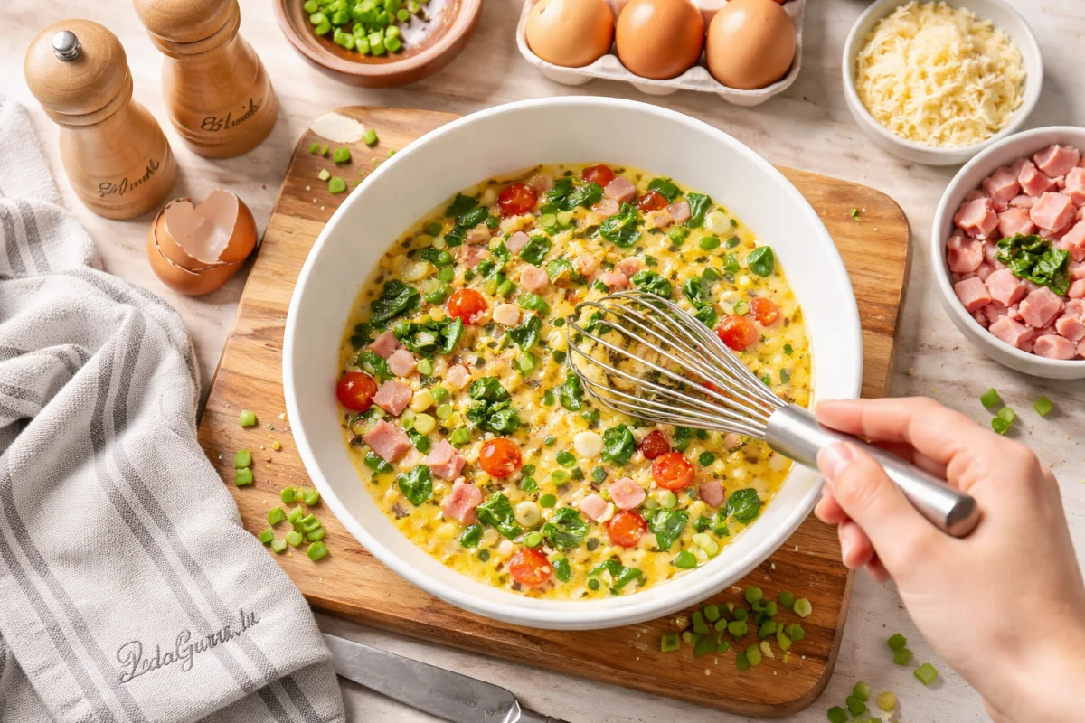 Яйца немного взбейте, затем соедините их с начинкой.