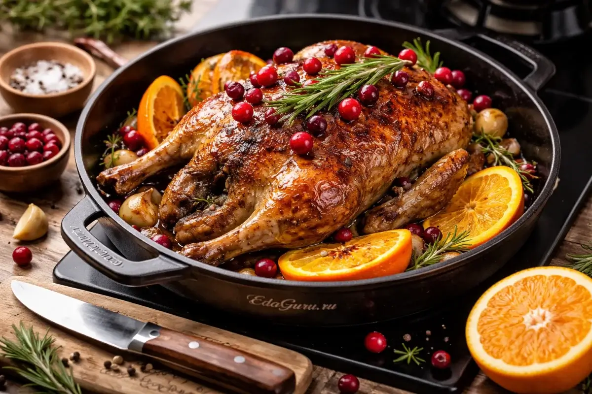 Уменьшите температуру до 180 °С и готовьте утку ещё 15–20 минут, пока она полностью не дойдёт до готовности. Подавая на стол, оформите её клюквой.