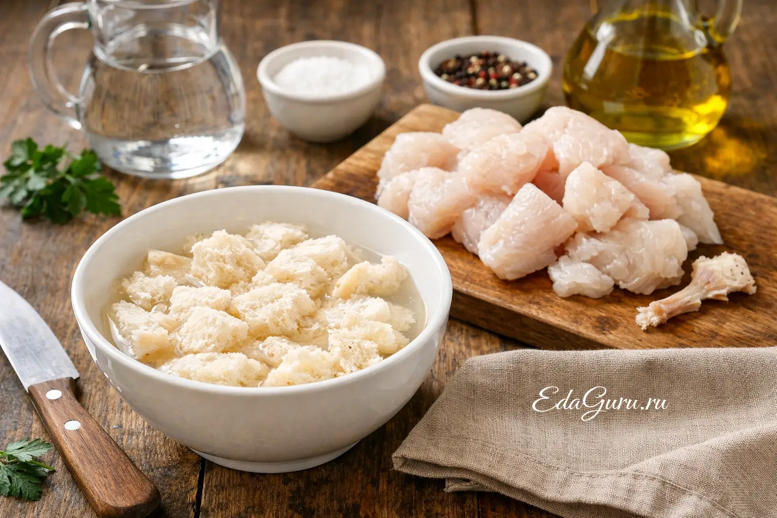 Белый хлеб без корки залейте холодной водой и оставьте ненадолго, примерно на 6 минут. Затем хорошо отожмите мякиш, чтобы в нем не осталось лишней влаги. Рыбное филе заранее нарежьте крупными кусками и внимательно проверьте, не осталось ли мелких костей.