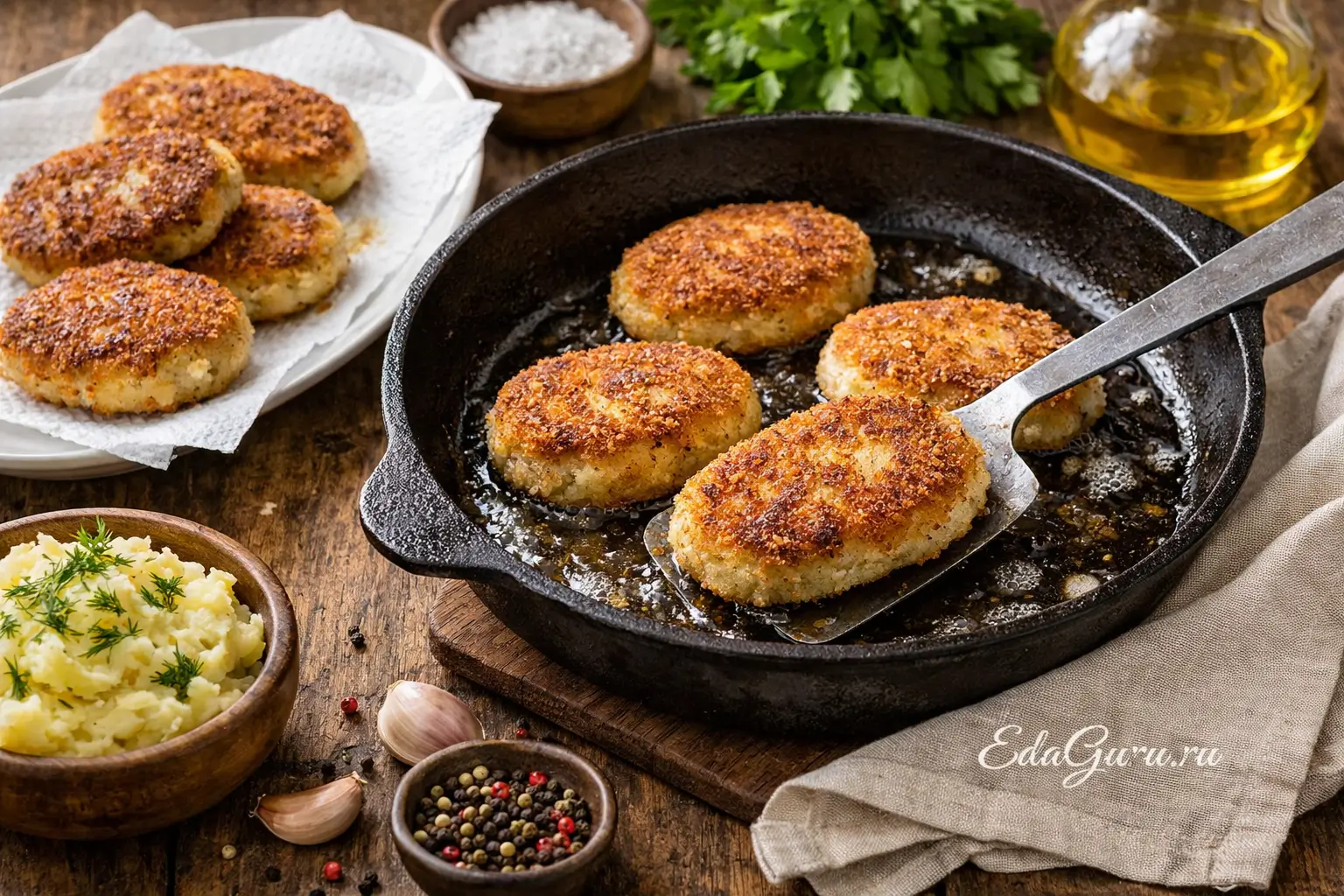 Разогрейте в широкой сковороде растительное масло слоем около полусантиметра. Жарьте котлеты на среднем огне партиями, не укладывая их вплотную друг к другу, до равномерной румяной корочки с обеих сторон. Готовые котлеты сначала выложите на бумажное полотенце, чтобы убрать лишнее масло, а затем подавайте горячими с картофелем, пюре или овощным гарниром.