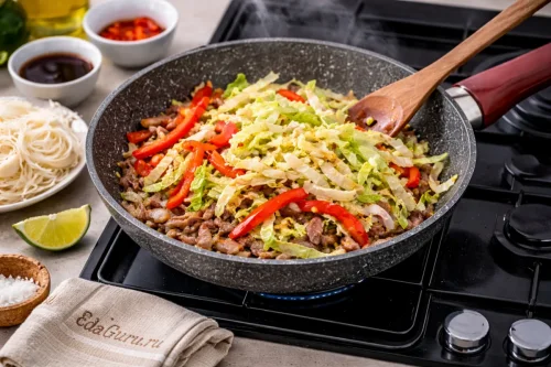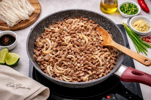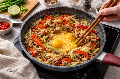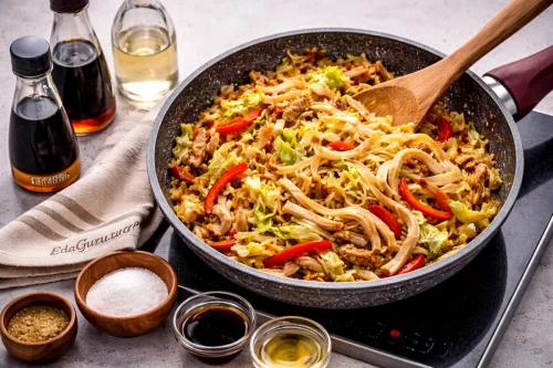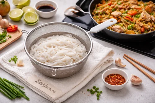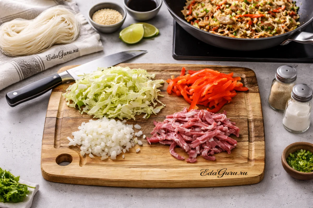 Рисовая лапша со свининой — быстрый вариант блюда в азиатском стиле, где важны сильный огонь, короткая обжарка и баланс соуса. Рисовая лапша особенно распространена в кухнях Китая и стран Юго-Восточной Азии: ее ценят за нейтральный вкус и способность хорошо впитывать соусы. Свинину для таких блюд обычно нарезают тонко, чтобы она приготовилась за считаные минуты и осталась сочной. Овощи можно менять по сезону: сладкий перец, морковь, зеленый лук, чеснок и имбирь часто используют именно из-за их яркого вкуса и быстрого времени приготовления. Такой рецепт удобен для будней: он не требует сложной подготовки, а весь процесс действительно укладывается примерно в 30 минут.