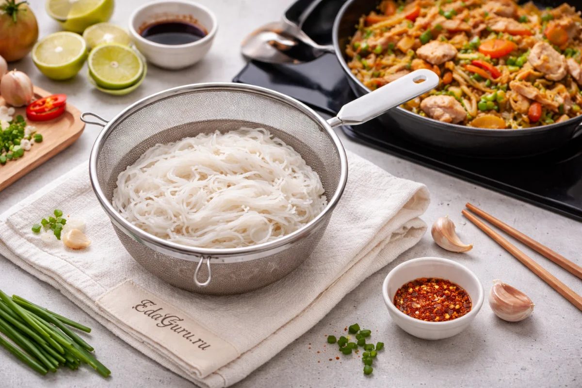Не переваривайте рисовую лапшу: лучше оставить ее чуть упругой, после промывки можно смешать с каплей масла, чтобы она не слипалась в сковороде.