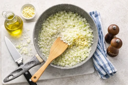 Очистите чеснок и лук, затем мелко их порубите. В сковороде или сотейнике с толстым дном обжарьте чеснок с луком на растительном масле в течение 10 минут, периодически помешивая.