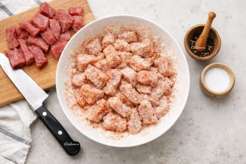 Нарежьте свинину брусочками длиной 5см, затем посолите и поперчите. Отдельно смешайте муку с двумя щепотками паприки и тщательно обваляйте в этой смеси кусочки мяса, чтобы панировка равномерно покрыла их со всех сторон. Для удобства можно делать это порциями, чтобы куски не слипались.
