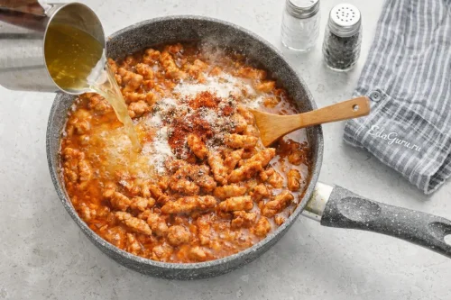 Всыпьте в сотейник оставшуюся паприку и всю муку, которая еще не использовалась, затем обжаривайте еще 30–40 секунд. После этого снимите сотейник с плиты и влейте воду или бульон. Хорошо размешайте массу, чтобы она стала однородной, без комочков. Посолите и поперчите по вкусу, затем снова поставьте сотейник на средний огонь. Чтобы мука не собралась в комки, жидкость лучше вливать постепенно, не прекращая помешивать.
