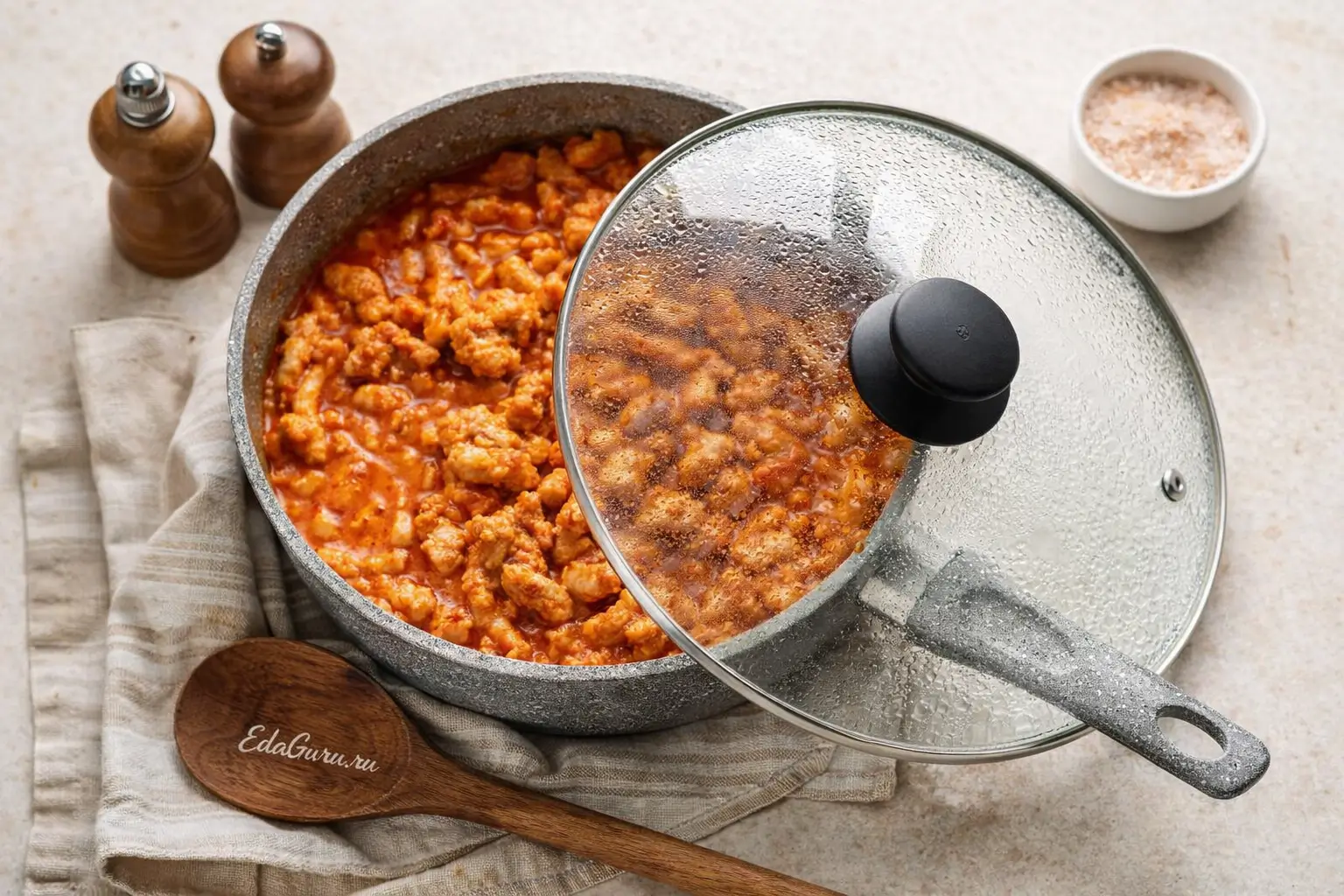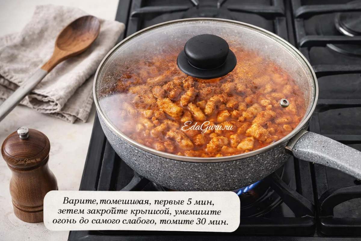 Первые 5 минут готовьте, периодически помешивая. Затем накройте крышкой, убавьте огонь до минимального и томите полчаса.