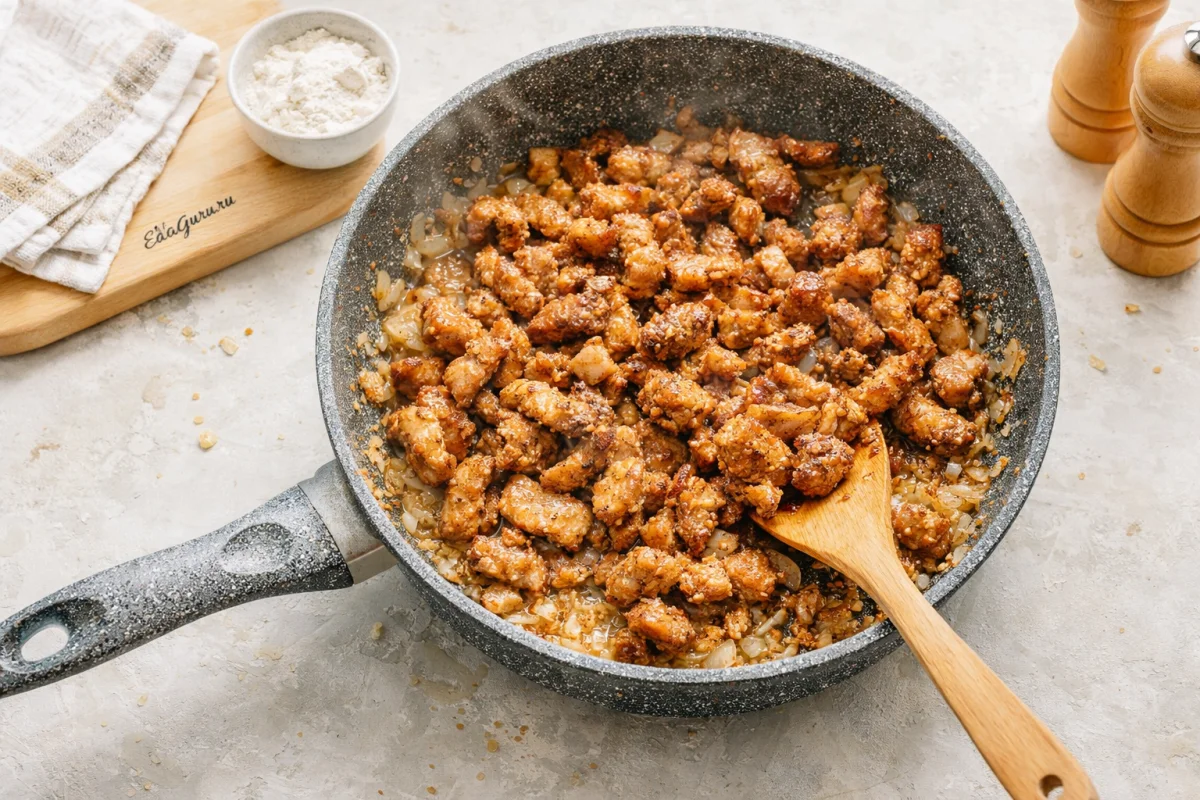 Подлива из свинины на сковороде — сытное и очень домашнее блюдо, которое выручит в любое время дня, даже утром, если предстоит много дел и нужны силы. Обычно такую мясную подливу подают с гарниром: особенно хорошо она сочетается с макаронами, картофельным пюре или гречкой. Но есть и другой удачный вариант — выложить ее на гренку: получается просто, необычно и очень аппетитно. В рецепте подробно показано, как правильно обжарить свинину и приготовить к ней несложную, но действительно вкусную подливу.