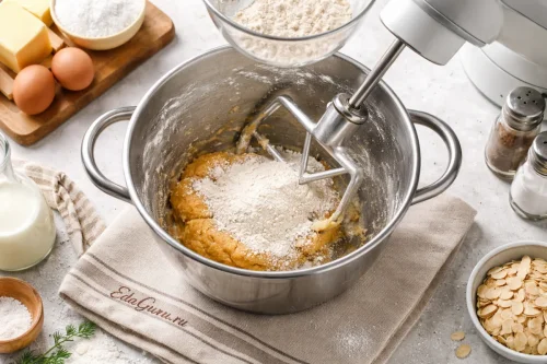 К смеси желтков, сахара и масла, подготовленной на предыдущем этапе, всыпьте просеянную пшеничную муку. Перемешайте миксером на низкой скорости и остановитесь сразу, как только масса станет однородной — долго взбивать не нужно.