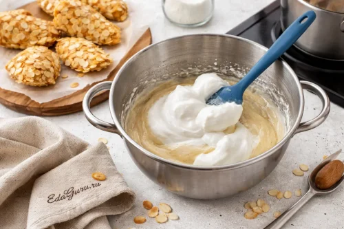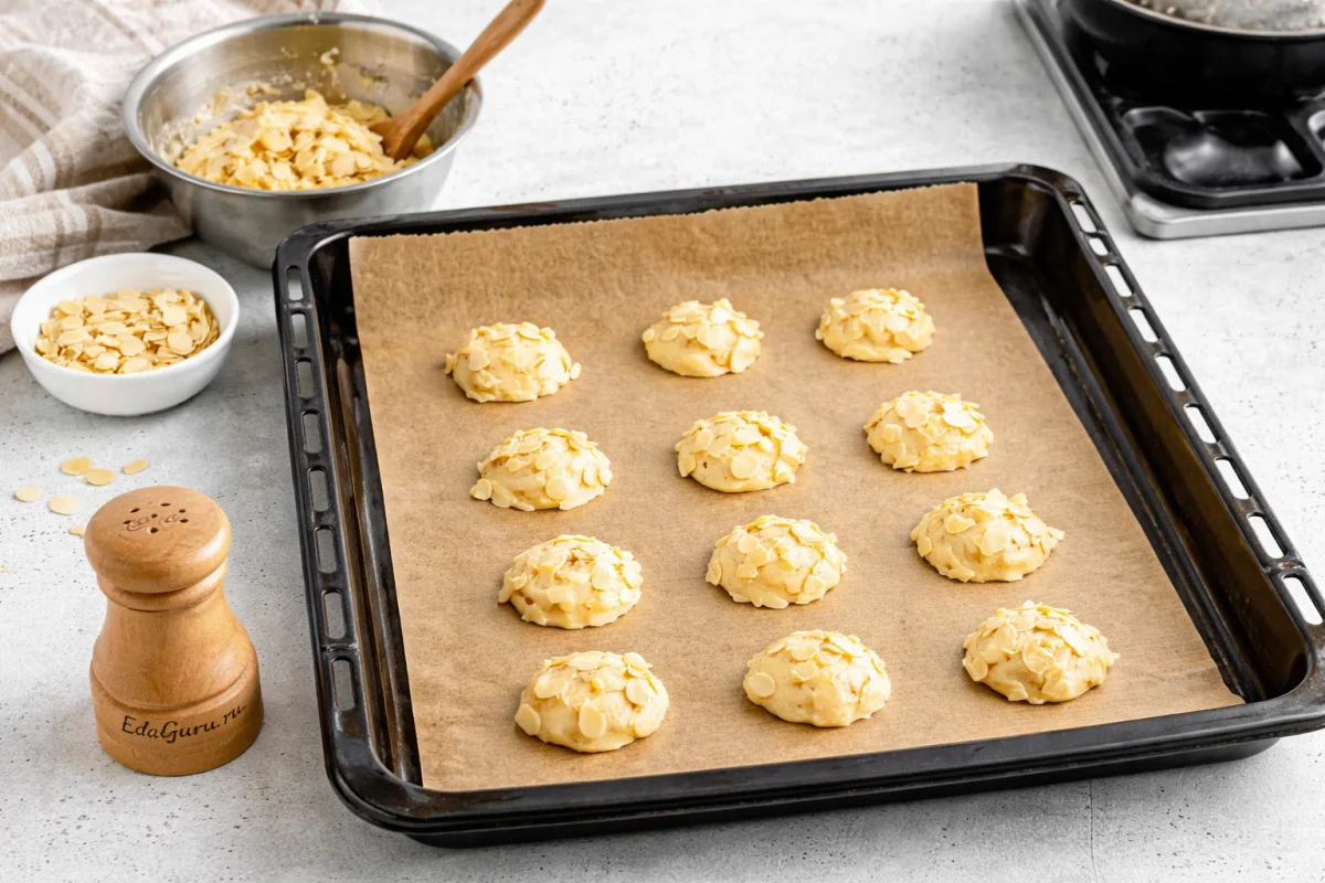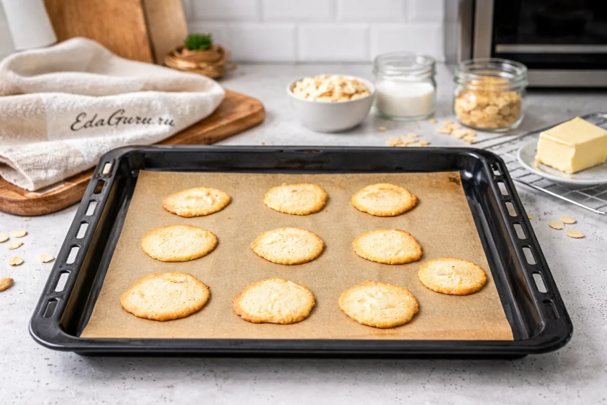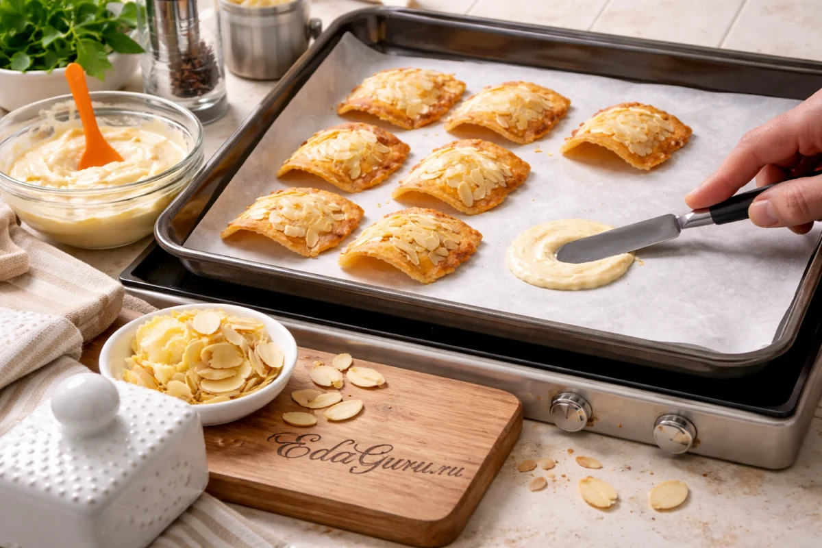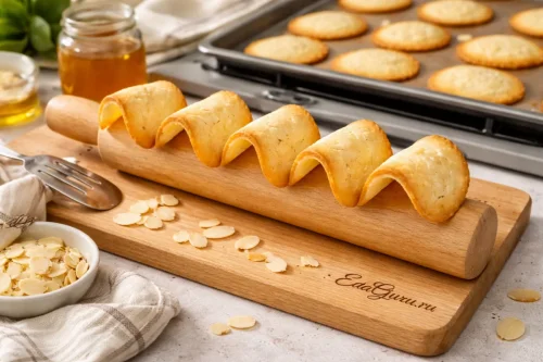 Тесто для тюиля лучше отсаживать очень тонким слоем и выпекать небольшими партиями: печенье схватывается за минуты, и формовать его нужно сразу, пока оно горячее и пластичное. Если миндальных лепестков нет, их можно заменить тонко нарезанным миндалем — текстура будет чуть грубее; а вместо пергамента удобнее взять тефлоновый коврик, если бумага часто подводит и печенье прилипает.