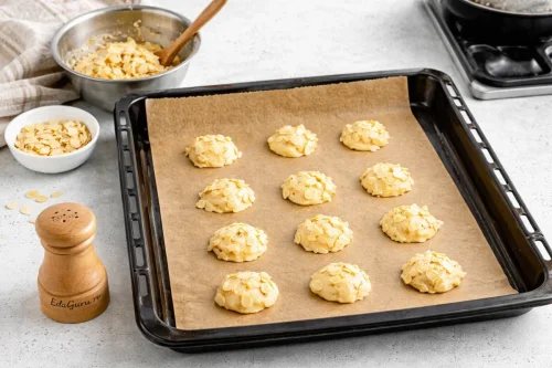 Вмешайте в массу миндальные лепестки, стараясь сделать это быстро. Затем, пользуясь ложкой, разложите тесто на хорошую силиконизированную бумагу небольшими круглыми порциями.