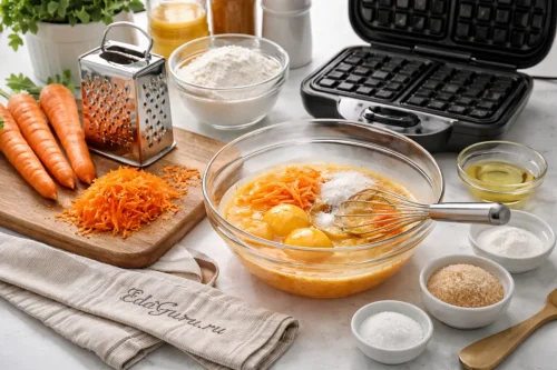 Морковные вафли в вафельнице — удачный вариант домашнего завтрака или перекуса к чаю. Тертая морковь делает тесто более сочным и придает выпечке естественную сладость, поэтому такие вафли получаются мягкими внутри и румяными снаружи. Идея добавлять морковь в десерты и выпечку не нова: морковные пироги и кексы давно известны в европейской и американской кухне, особенно как практичный способ сделать тесто влажным и ароматным. Вафли с морковью — более современная вариация этой идеи. Их можно подать со сметаной, йогуртом, творожным сыром, медом или свежими ягодами. Блюдо удобно тем, что оно подходит и для неспешного выходного завтрака, и для домашнего чаепития.