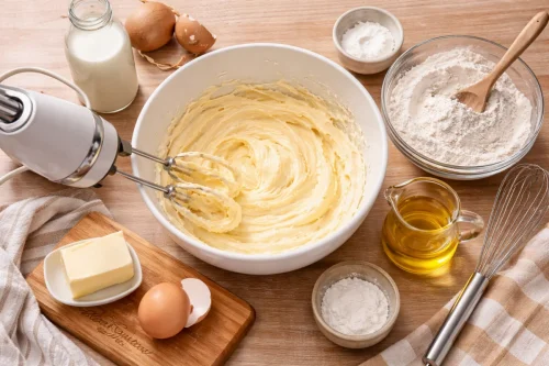 Добейтесь, чтобы масса стала светлой, воздушной и легкой. Затем добавьте масло и молоко, после чего еще раз все взбейте. Отдельно соедините муку с разрыхлителем, чтобы он равномерно разошелся в тесте.