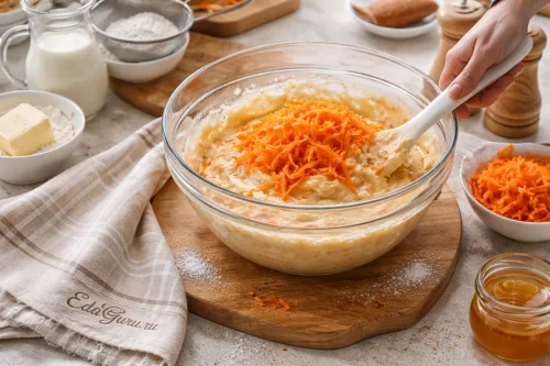Мучную смесь всыпайте частями, каждый раз хорошо размешивая массу лопаткой или миксером. Затем добавьте натертую морковь и снова перемешайте. Проверьте тесто по густоте: по консистенции оно должно быть таким же, как для оладий. Если нужно, влейте немного молока или, наоборот, подсыпьте чуть-чуть муки.
