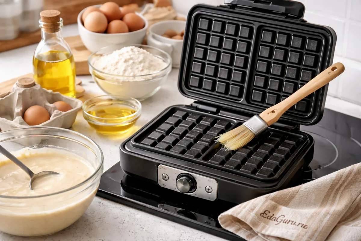 Пора переходить к приготовлению вафель. Как правило, пластины вафельницы имеют антипригарный слой, однако, если есть сомнения в его надежности, сначала слегка покройте их рафинированным растительным маслом и только после этого распределяйте тесто.