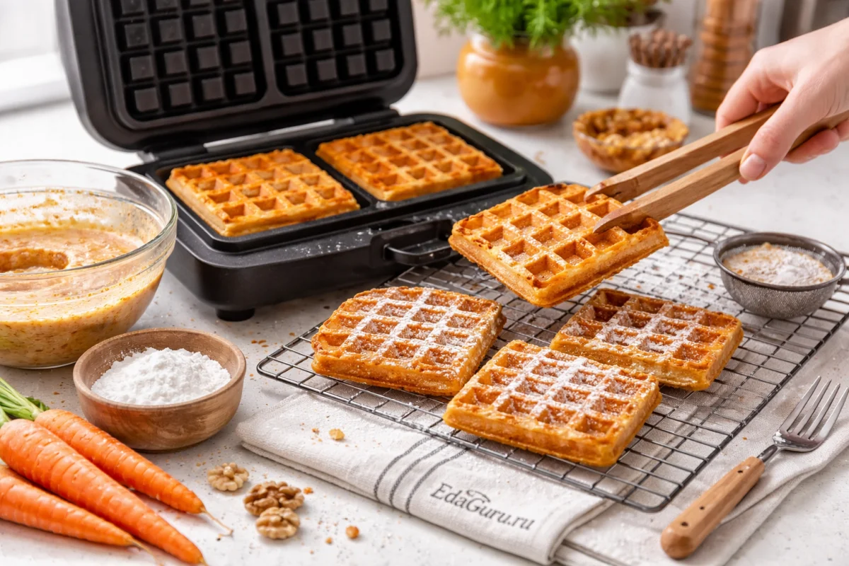 Если морковь очень сочная, слегка отожмите ее, иначе тесто получится водянистым и вафли будут хуже подрумяниваться; после выпечки обязательно остужайте их на решетке, чтобы корочка не отсырела. Ванильный сахар можно заменить щепоткой корицы или добавить немного апельсиновой цедры — это особенно хорошо подходит морковной выпечке и делает вкус ярче без изменения текстуры.