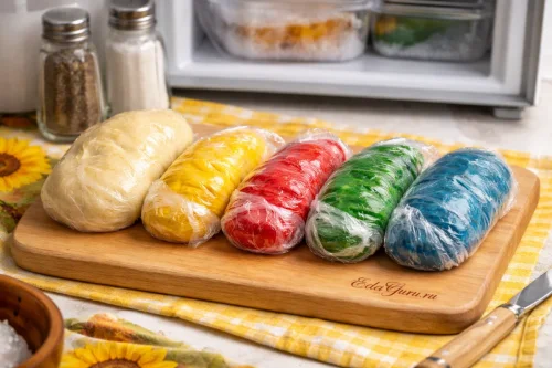 Тесто разрежьте на части: одну треть не окрашивайте, а оставшуюся массу поделите еще на пять равных порций и придайте каждой свой цвет. Затем все кусочки оберните пленкой и поместите в морозилку на 30 минут.