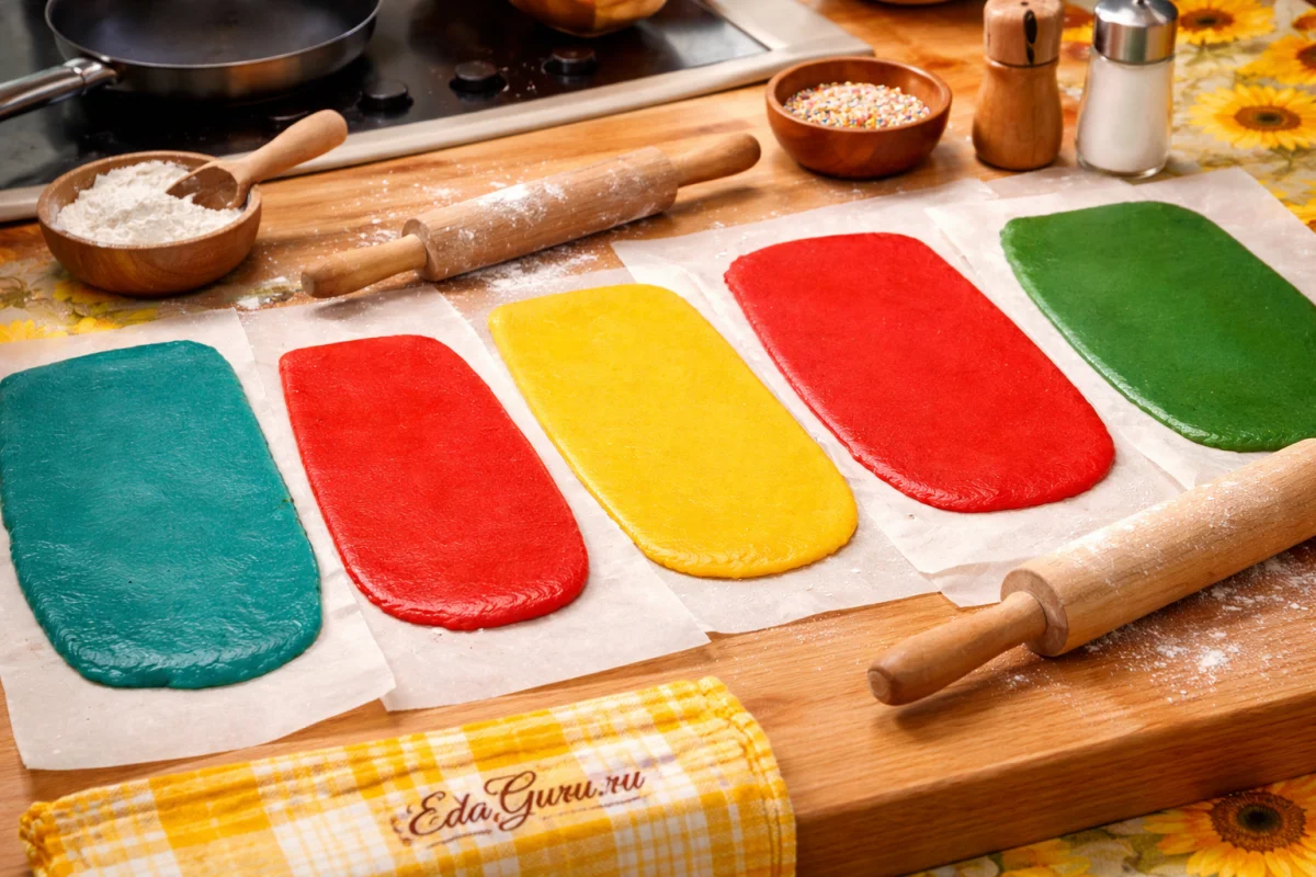 Окрашенные части теста раскатайте в отдельные пласты. Дальше я это покажу.