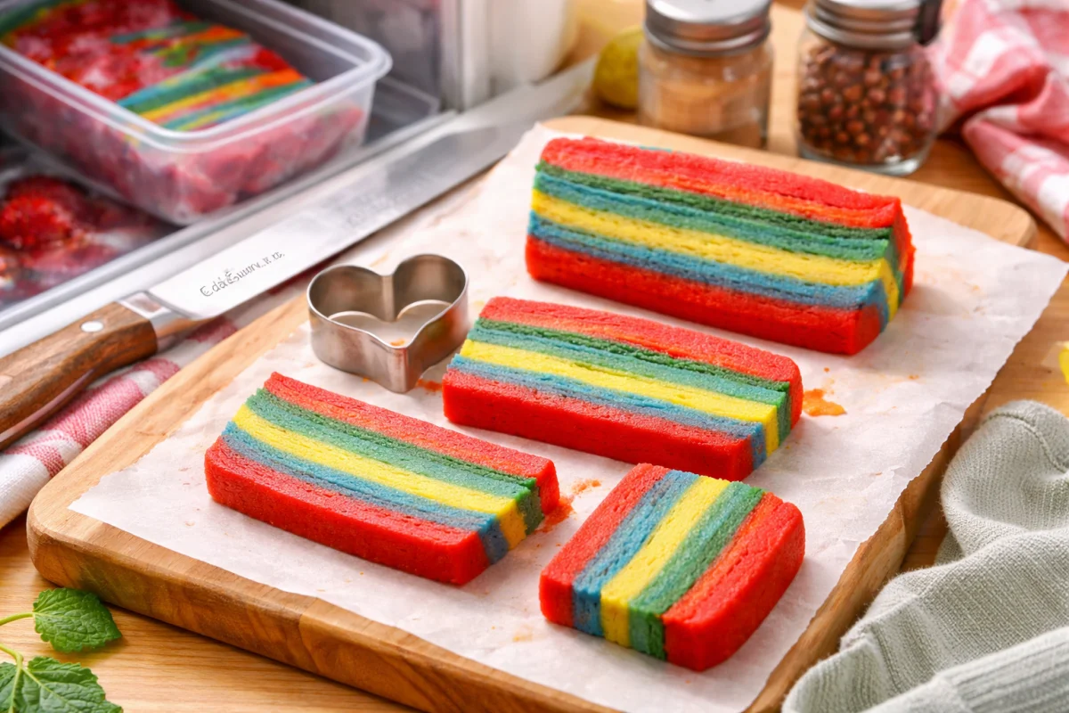 Выньте окрашенный пласт из морозилки и разрежьте его на полоски, ориентируясь на ширину формы для вырубки.