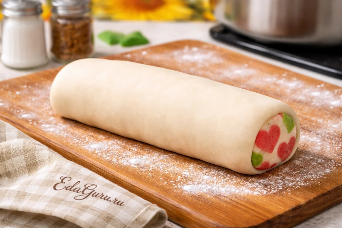 Скрепленные сердечки осторожно оберните белым тестом, после чего сформируйте из заготовки колбаску.