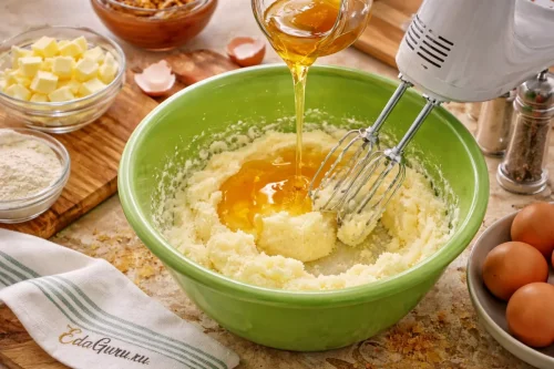 Масло в течение 5 минут взбейте с сахаром, пока масса не посветлеет. Затем добавьте мед и еще раз тщательно взбейте. После этого по одному вводите яйца, каждый раз хорошо взбивая смесь.