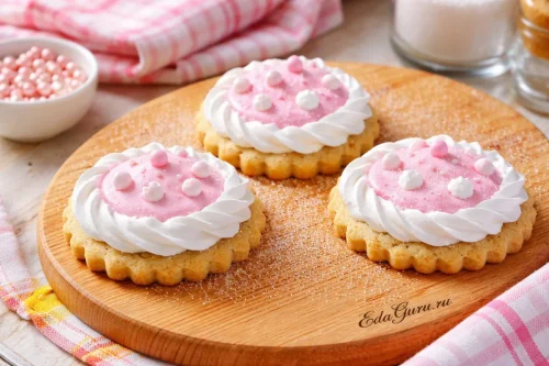Верх оформите взбитыми до белой пены белками, сверху присыпьте сахаром. После украшения оставьте изделие подсыхать на 3–4 часа.