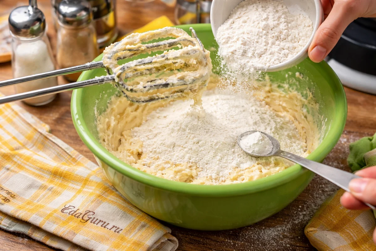 Всыпьте муку вместе с разрыхлителем и тщательно размешайте массу до однородности.