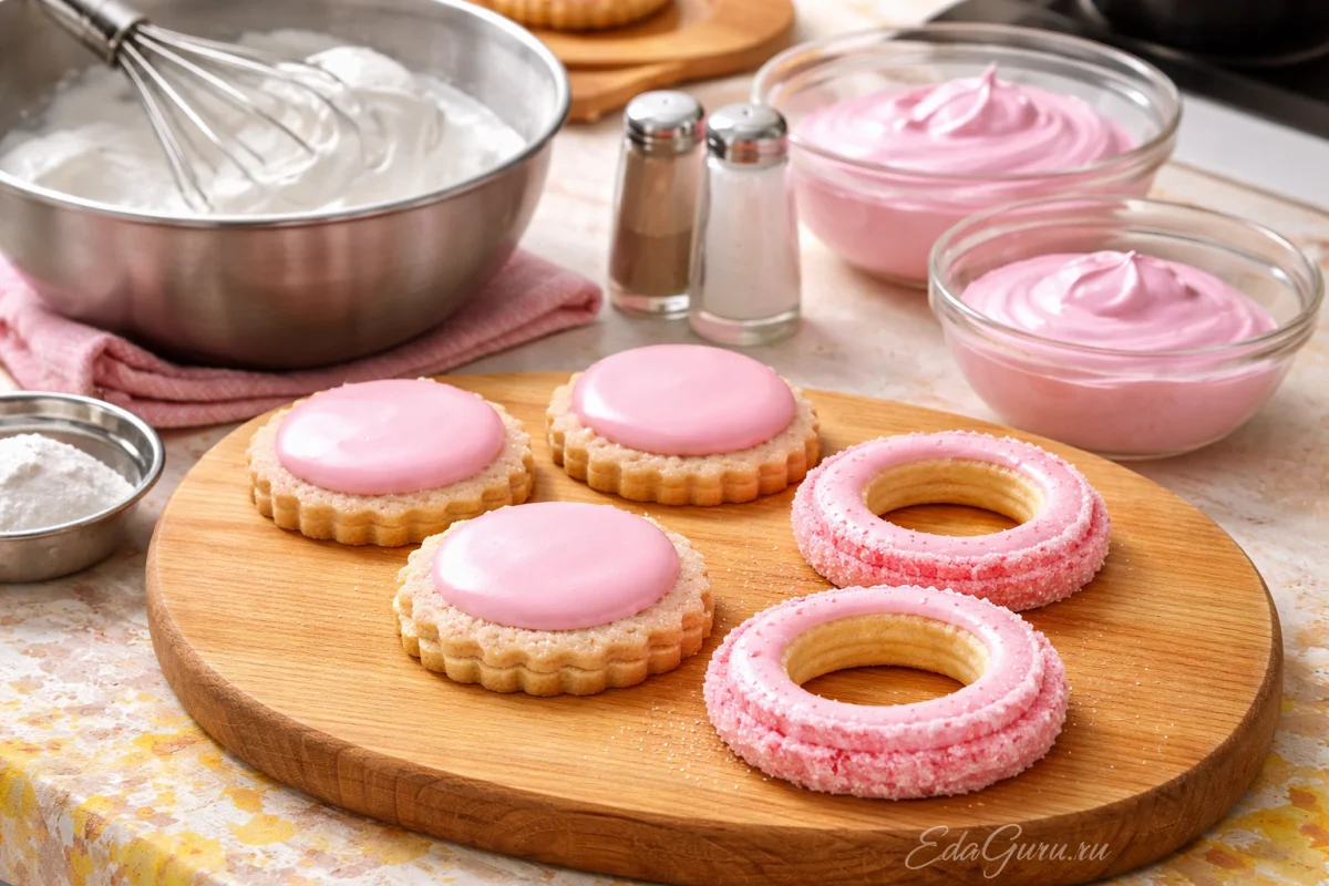 Яичный белок соедините с тремя ложками сахарной пудры и хорошо взбейте. Получившуюся смесь разделите: одну часть оставьте без окрашивания, а две другие сделайте розовыми. Розовой массой оформите верх кольца, затем покройте ею боковые стороны у основания и присыпьте сахаром. После этого оставьте изделие на 3–4 часа.