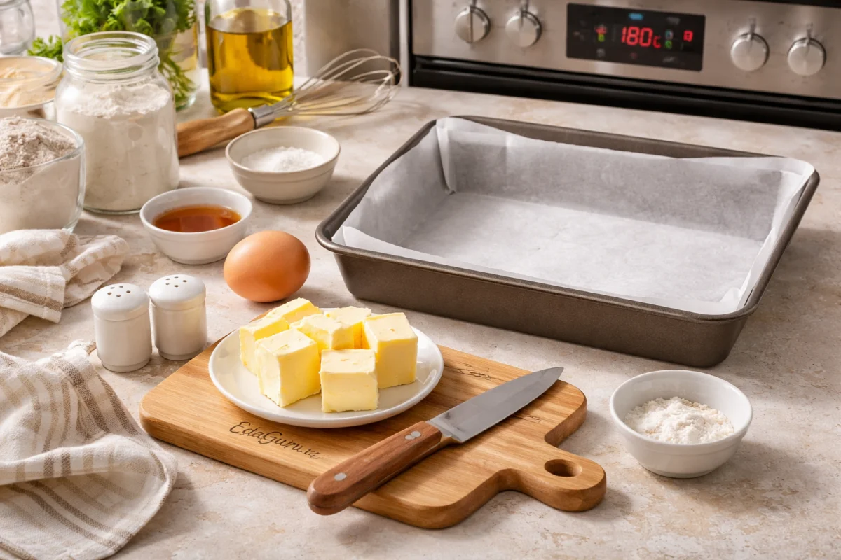 Сначала соберите все необходимые продукты. Сливочное масло выньте из холодильника заблаговременно: к началу работы оно должно стать мягким, оставаясь плотным, без подтаивания. Яйцу также дайте немного полежать при комнатной температуре. Тем временем включите духовку на 180°C, а форму размером около 20×30 см выстелите пергаментом.