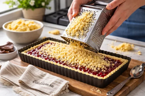 Поставьте форму в духовку, заранее нагретую до 180°C, и выпекайте 25–30 минут, пока крошка не станет слегка золотистой. Готовый тертый пирог оставьте в форме до полного остывания.