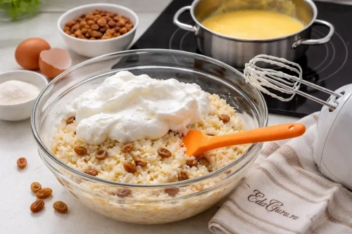 Белки вмешивайте в тёплую, а не горячую рисовую основу, иначе пена осядет; готовность проверяйте по слегка дрожащему центру — при остывании пудинг стабилизируется и останется нежным.