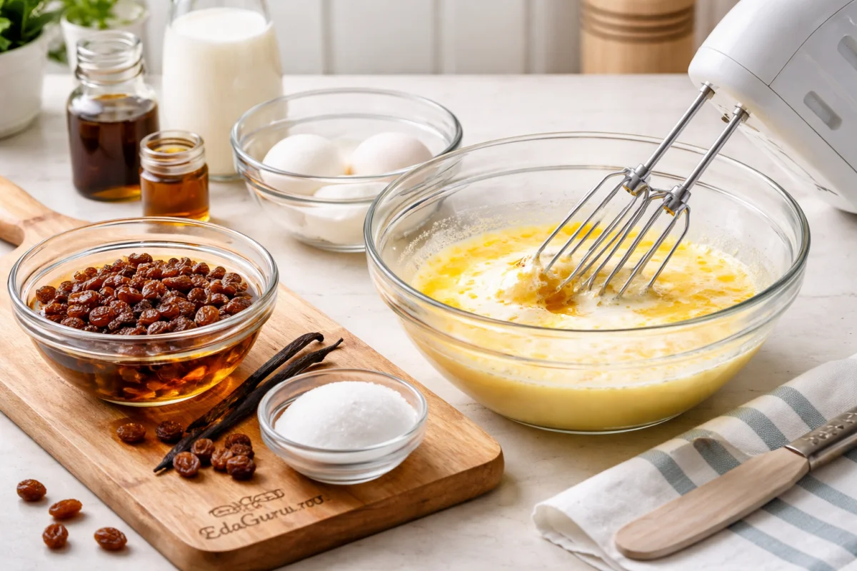 Сначала хорошо промойте изюм и оставьте его в теплой воде на 15 минут. Яйца разделите на белки и желтки. Желтки соедините с половиной сахара и взбейте миксером. Затем добавьте оставшееся молоко вместе с ванильным экстрактом и еще раз все взбейте.