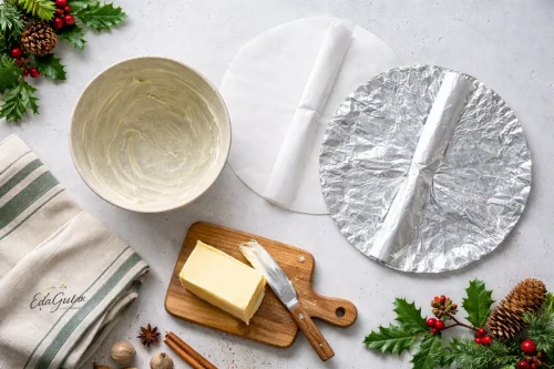 Форму для пудинга вместимостью 900 мл тщательно покройте сливочным маслом. Затем подготовьте по одному листу пергамента и фольги: в центре каждого заложите складку около 4 см и вырежьте из них круги так, чтобы их диаметр был на 3–4 см больше диаметра формы.