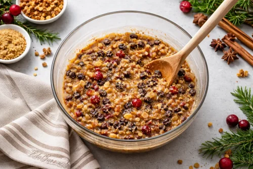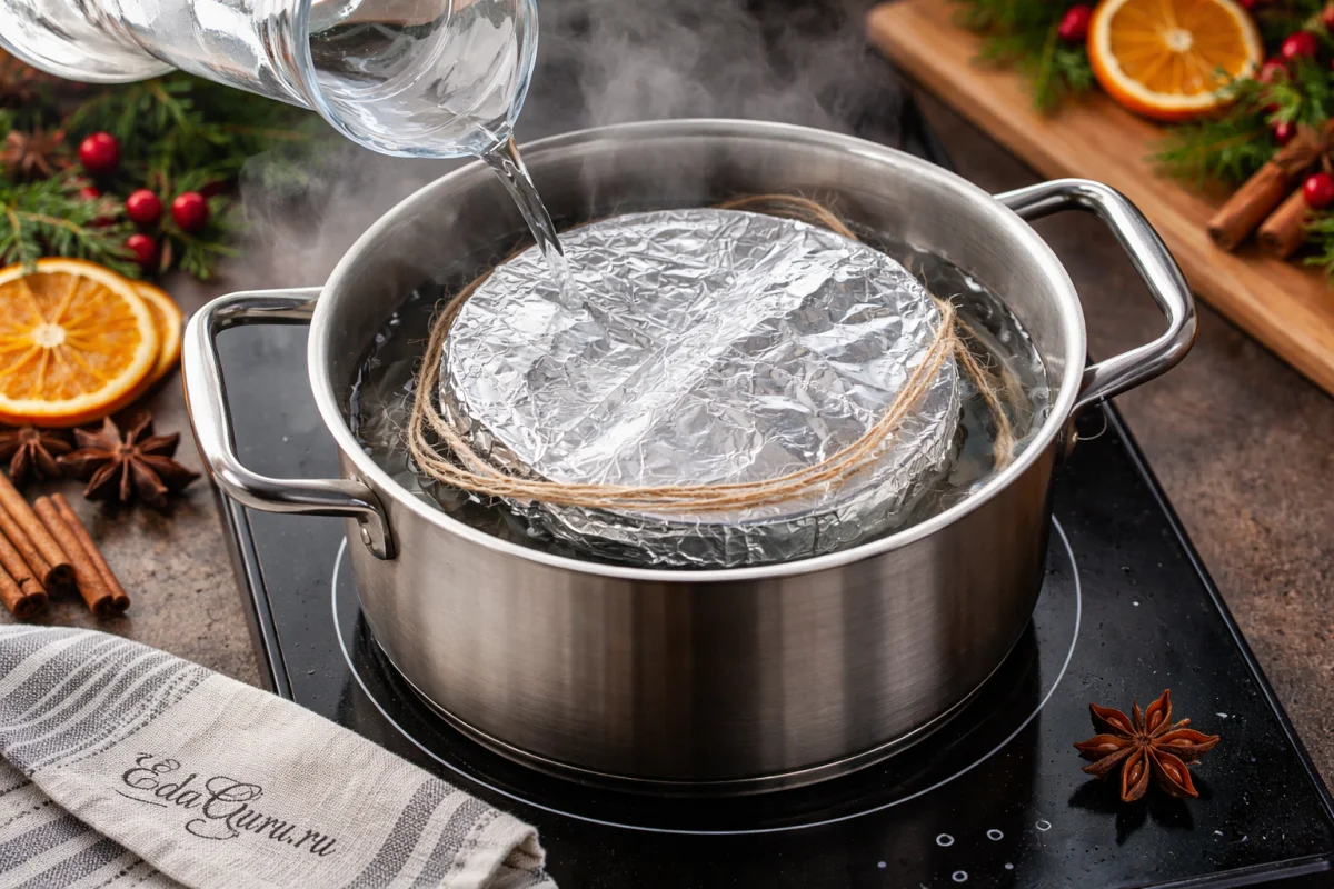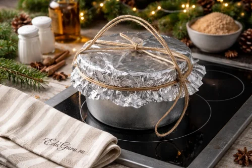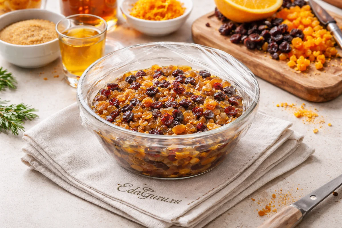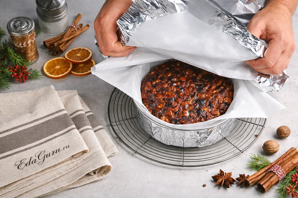 Сухофрукты лучше выдержать в соке и ликере не меньше 12 часов, а после варки дать пудингу созреть хотя бы 2–4 недели: вкус станет глубже, а текстура — более влажной и плотной. Во время долгой варки следите, чтобы вода доходила примерно до середины формы и не выкипала, иначе пудинг прогреется неравномерно и может подсохнуть по краям; складка в пергаменте и фольге обязательна, чтобы дать массе место для подъема. Вместо клюквы можно взять смородину или дополнительный изюм, если нужен более классический вкус без выраженной кислинки, а ликер при необходимости заменить крепким чаем или яблочным соком — аромат будет мягче, но пудинг сохранит нужную сочность.