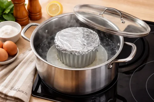 На дно просторной кастрюли поместите перевернутое блюдце или небольшую тарелку. Сверху поставьте форму с пудингом, затем влейте кипящую воду так, чтобы ее уровень доходил до середины формы. Закройте кастрюлю крышкой и дождитесь закипания.