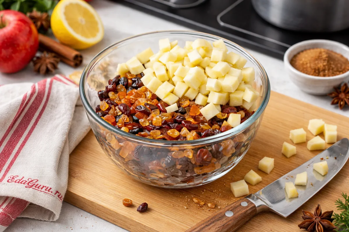 С яблока снимите кожуру, мякоть измельчите мелким кубиком и соедините с сухофруктами. Традиционный рождественский пудинг