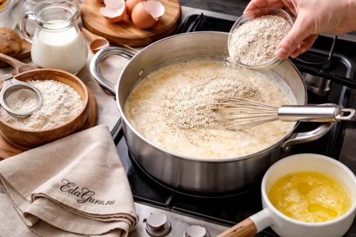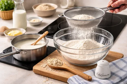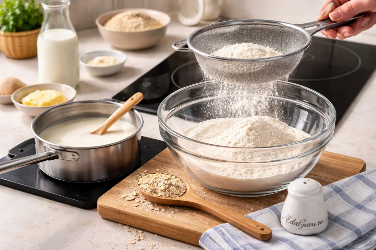 Начните с основы для овсяных блинов: в миску через сито пропустите муку. Молоко перелейте в просторную кастрюлю и подогрейте примерно до 35–37°C. Если кухонного термометра нет, проверьте температуру рукой: молоко должно ощущаться горячим, но не обжигать палец — тогда кастрюлю можно убрать с плиты.