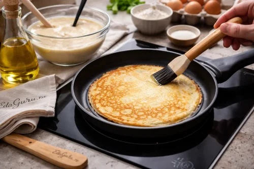 Разогрейте на среднем огне блинную сковороду с толстым дном. При помощи кулинарной кисточки тонко покройте ее растительным маслом, затем налейте небольшую порцию теста и жарьте около 1,5 минут, пока блин не подрумянится.