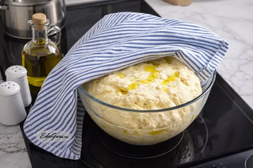 Масло добавьте в самом конце, после чего хорошо вымесите тесто. Затем прикройте его полотенцем и на 1 час уберите в теплое место с температурой не ниже 25 °C, чтобы оно увеличилось в объеме и приобрело пористую структуру.