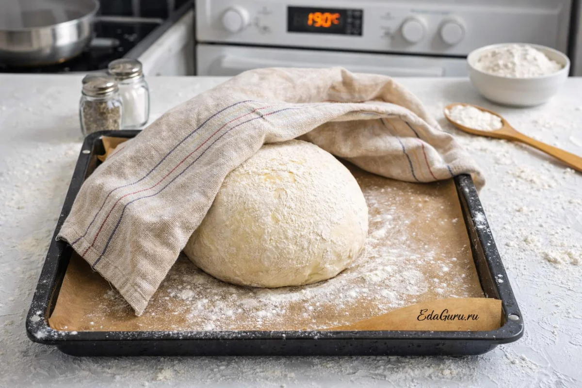 Перенесите тесто на рабочую поверхность, слегка припорошенную мукой, и придайте ему форму шара. Затем уложите его на противень с листом пергамента, прикройте полотенцем и дайте постоять 30 минут. Тем временем прогрейте духовку до 190 °C.