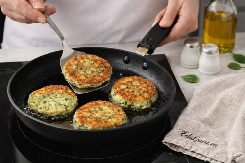 На горячую сковороду с оливковым маслом ложкой выкладывайте небольшие порции теста и жарьте оладьи с двух сторон, пока не появится румяная корочка.
